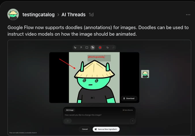 Google Flow added image doodle functionality on October 22, allowing users to draw annotations, arrows, and shapes directly on images to guide the Veo 3 video model in animation processing. This visual instruction method eliminates the need for complex text prompts, enabling creators to communicate movement direction and scene changes through intuitive sketching. Early testers report significantly more natural workflow compared to lengthy text descriptions.threads+2
