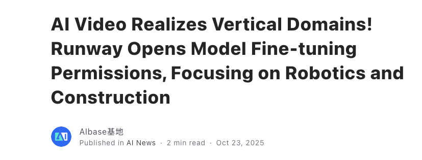 Runway announced on October 21 that it's providing select pilot partners with fine-tuning access to its generative video models, targeting robotics, education, life sciences, and architecture sectors. The company acknowledged that standard general-purpose models often fail at industry-specific "real-world tasks," with the new fine-tuning tools designed to simplify customization while requiring less data and computational resources.aibase+1