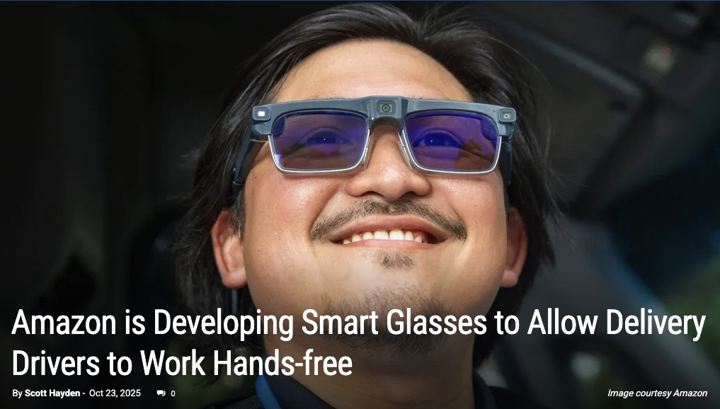 Amazon announced development of AI-driven smart glasses for delivery personnel, integrating computer vision, sensors, and cameras to display real-time navigation, hazard warnings, and delivery information directly in drivers' field of vision. The glasses automatically activate when drivers park and work with a vest-mounted controller containing replaceable batteries and emergency buttons. The technology supports package scanning, route navigation, and delivery confirmation without requiring phone interaction, currently undergoing pilot testing in North America.roadtovr+1