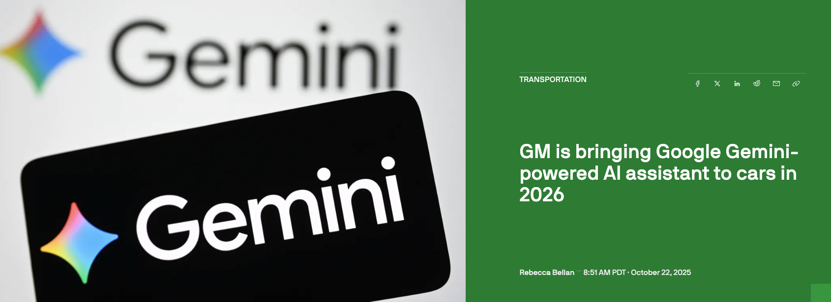 GM announced at its October 22 "GM Forward" event that it will integrate Google Gemini conversational AI assistant across Buick, Chevrolet, Cadillac, and GMC brands starting in 2026. The assistant will replace the existing "Google built-in" system, offering natural voice interaction with context memory, accent understanding, and flexible response capabilities. Features include message drafting, multi-point route planning with charging stations, meeting preparation, and real-time question answering about surroundings.techcrunch+2