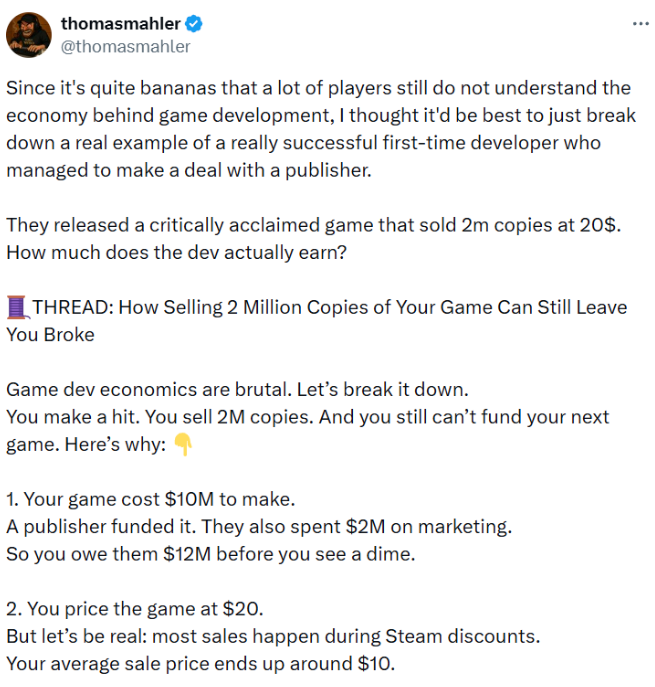Recently, Thomas Mahler, founder of Moon Studios GmbH, took to X to break down the harsh economics behind making money with games. He wanted to clear up the confusion many players have about what really happens when a game “succeeds.”